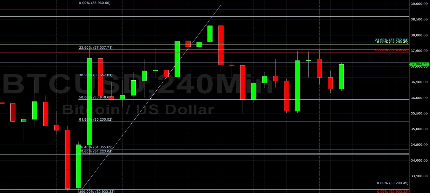 Bitcoin (BTC/USD) remained capped by some technical resistance early in today’s Asian session as the pair encountered selling pressure around the 37518.29 area, representing a test of the 23.6% retracement of the appreciating range from 32933.33 to 38960.  Buying pressure emerged around the 36162 area early in the North American session, representing a test of the 61.8% retracement of the interday appreciating range from 35526 to 37518.   Some Stops were recently elected above the 37456.66 area during the climb higher, an upside retracement level that represents the 23.6% retracement of the recent depreciating range from 52100 to 32933.33.  Additional upside retracement levels in this range include the 40255, 42516, 44778, 47576, and 47998 areas.  Another downside price objective related to selling pressure around the 52100 and 47076.55 levels is the 28625.93 area.