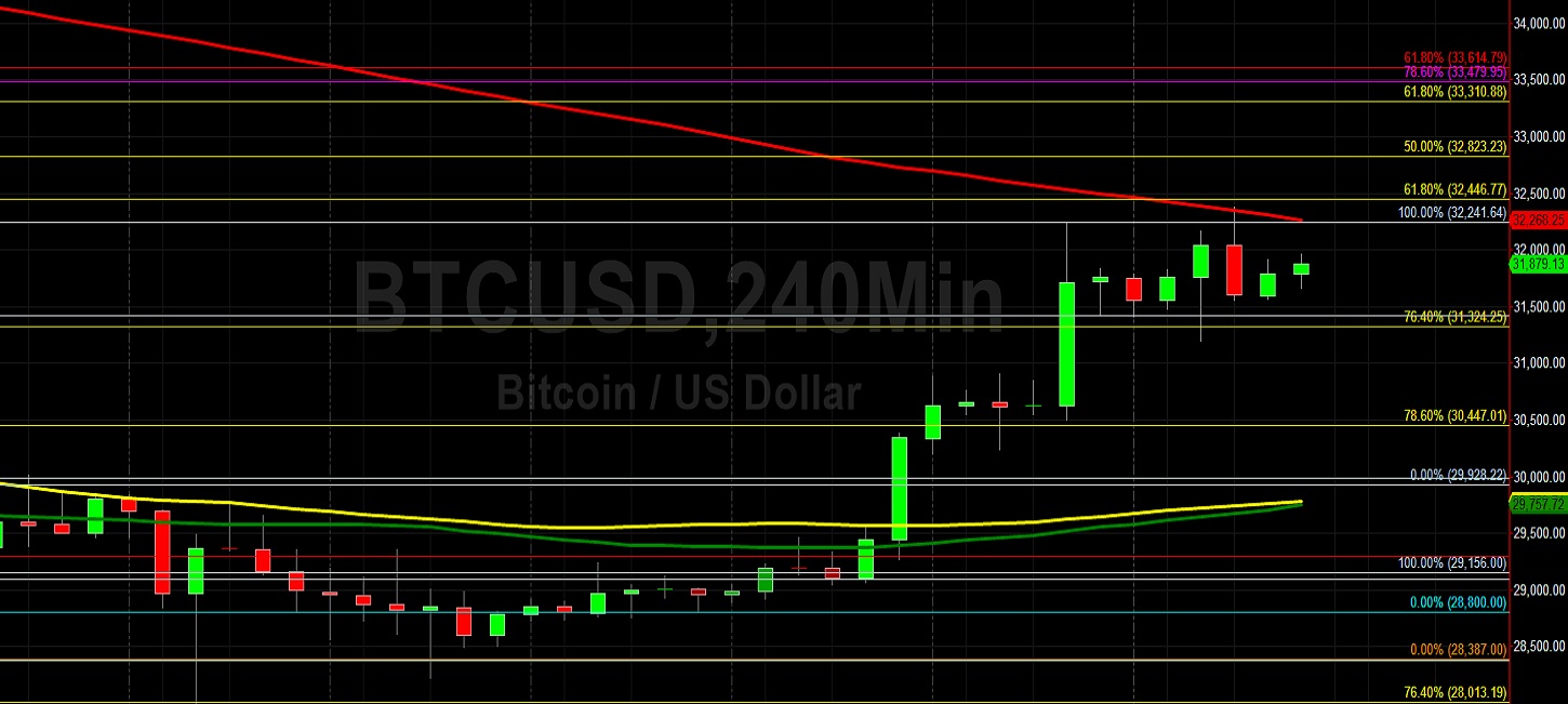 Bitcoin (BTC/USD) worked to advance recent gains early in the Asian session as the pair looked to appreciate further above the 32000 figure after recently trading as high as the 32383.96 area, representing a test of the 200-bar, 4-hour simple moving average. This move to multi-day highs also represented as test of the 61.8% retracement of the appreciating range from 14310 to 61788.45. Stops were recently elected above the 31324.25 area, representing the 76.4% retracement of the appreciating range from 21913.84 to 61788.45. If BTC/USD continues its upward trajectory, additional areas of potential technical resistance include the 32446, 32823, 33310, 33479, 33714, 34272, and 34467 levels. Before the recent upswing, recent move to relative lows opened up possible tests of additional short-term technical support around the 27661, 26773, and 26639 levels.