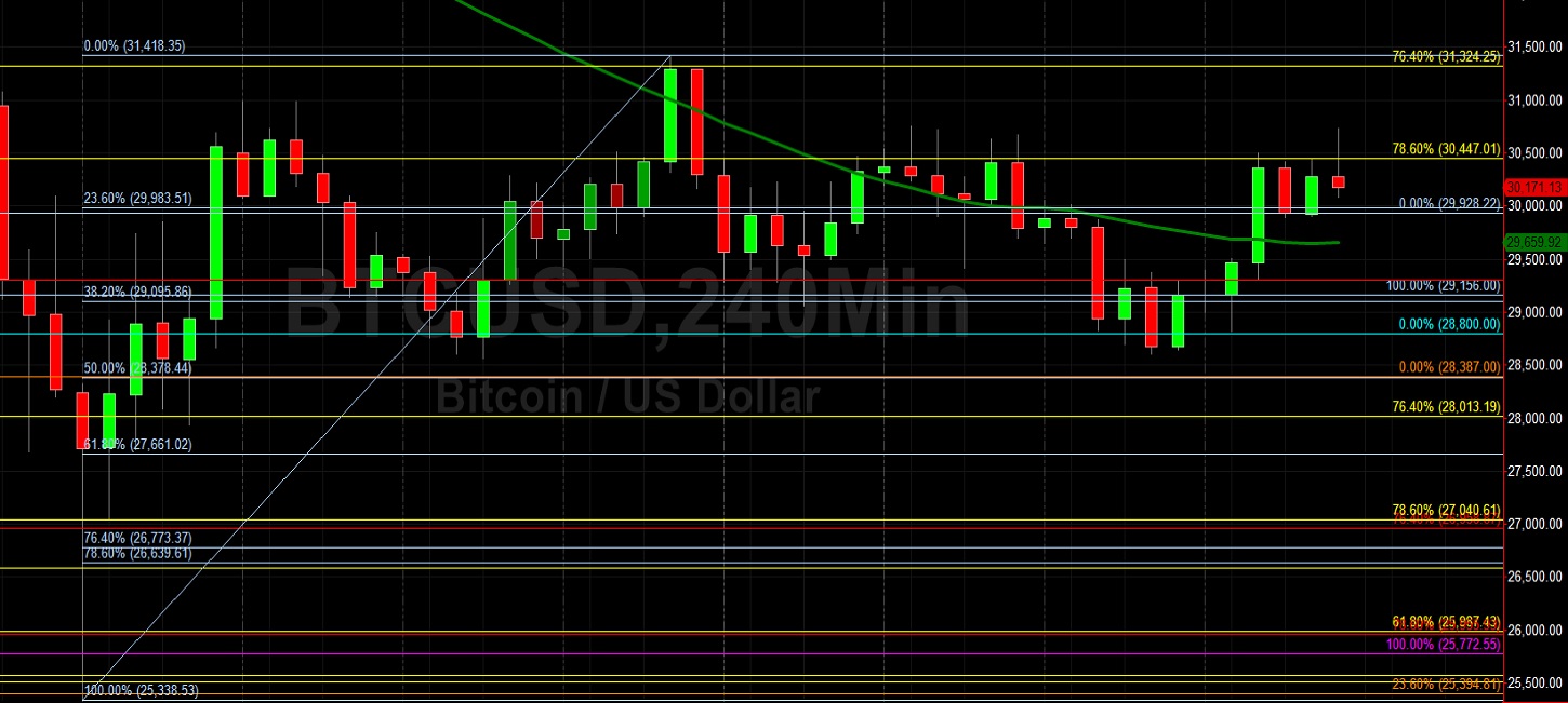 Bitcoin (BTC/USD) continued its sideways trading activity early in the Asian session as the pair traded back above the psychologically-important 30000 figure after demand emerged around the 28605 level, just above the 50% retracement of the recent appreciating range from 25338.53 to 31418.35. The move to recent lows opened up possible tests of additional short-term technical support around the 28378, 27661, 26773, and 26639 levels. Traders continue to eye the 30447 area, a level that represents the 78.6% retracement of the recent appreciating range from 21913.84 to 61788.45. Traders observe that the recent low around the 25338.53 area represented a test of the 23.6% retracement of a historical appreciating range from the 15708.24 level to the 28387 area, and was also above the 24365.11 area, a downside price objective related to selling pressure that emerged around the 48240 area.