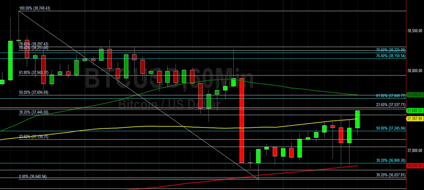 Price activity is nearest the 50-bar MA (4-hourly) at 36829.56 and the 100-bar MA (Hourly) at 37397.81.