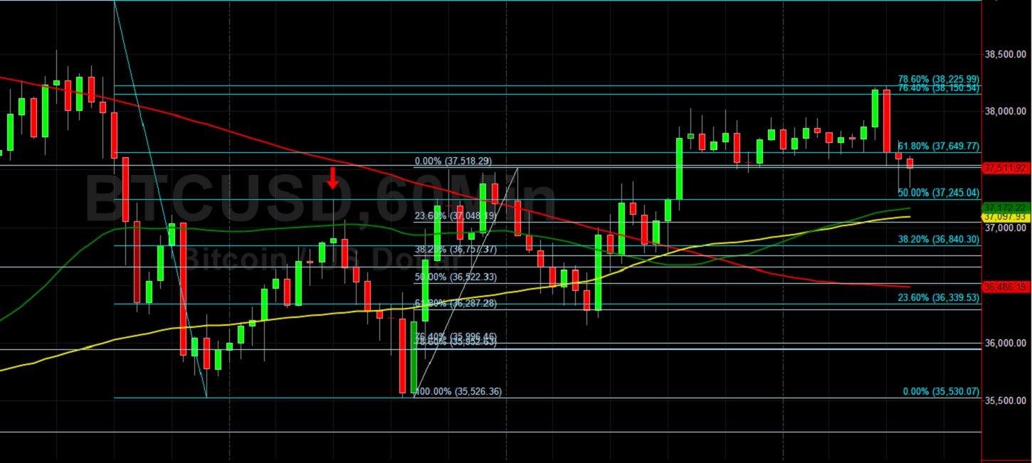 Stops are likely in place below the 31639.47 area, a downside price objective related to selling pressure that intensified around the 57670.68 area. Additional downside price objectives include the 29514, 27721, 25839, and 25217 levels. If BTC/USD recovers from its recent selling pressure, upside price resistance and areas of potential selling pressure include the 38222, 39144, 39470, and 40255 levels. Traders are observing that the 50-bar MA (4-hourly) is bearishly indicating below the 200-bar MA (4-hourly) and above the 100-bar MA (4-hourly). Also, the 50-bar MA (hourly) is bullishly indicating above the 100-bar MA (hourly) and above the 200-bar MA (hourly).
