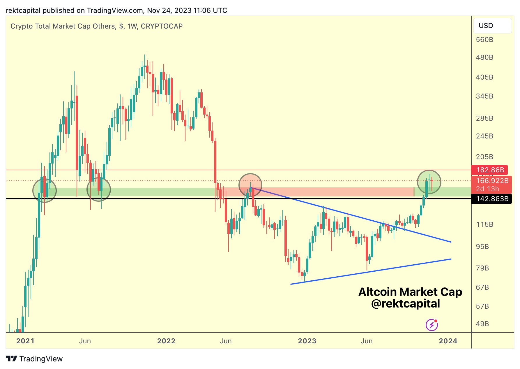 Pseudonymous crypto trader Rekt Capital tells their 371,000 followers on the social media platform X that the overall market for altcoins is approaching a market cap last touched around August of 2022.